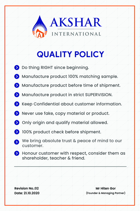 Akshar International have well defined Quality Control & Quality Assurance department. The company has well equipped and organized laboratory, controlled by qualified and experienced staff. Being an ISO certified unit, the procedures laid down by the systems are maintained and followed strictly as per the regulations of the ISO procedures.